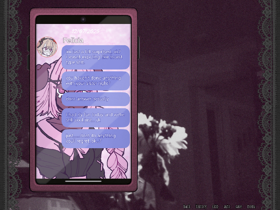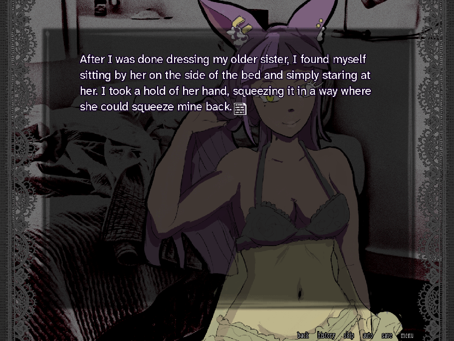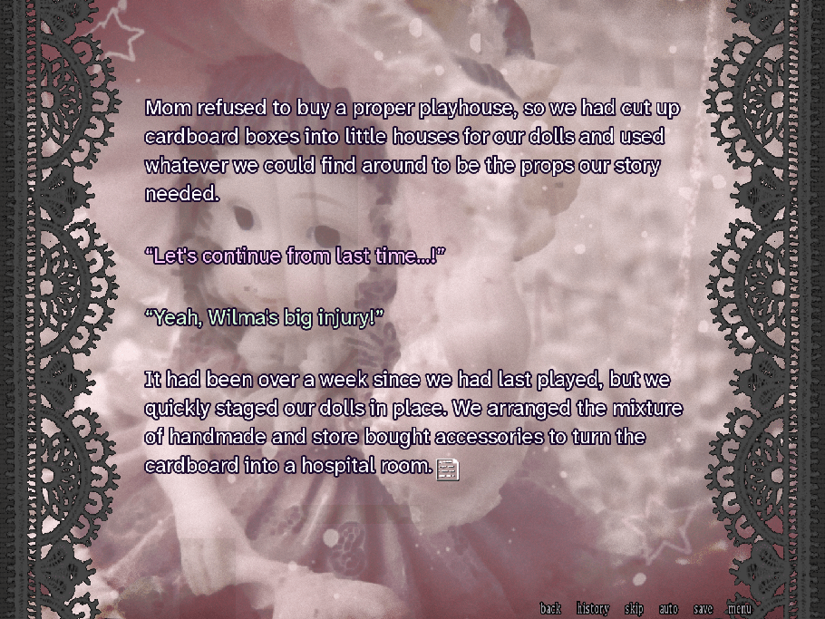 Dolls are fantastic. You have complete control over them. You are able to put yourself into them. A 25,000-word linear visual novel explaining the similarities between being a girl, a sister, and a doll.